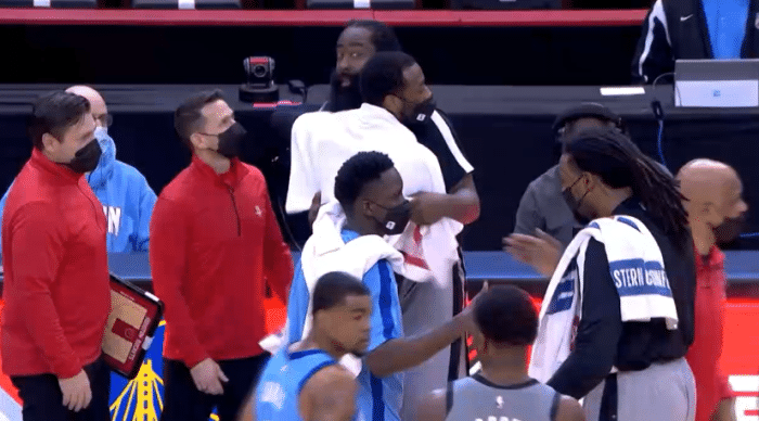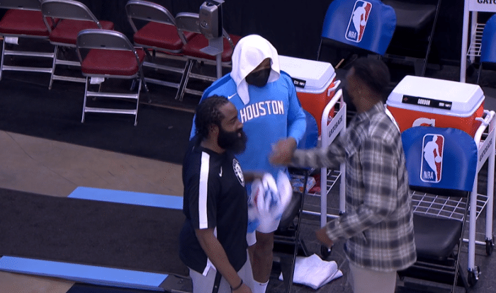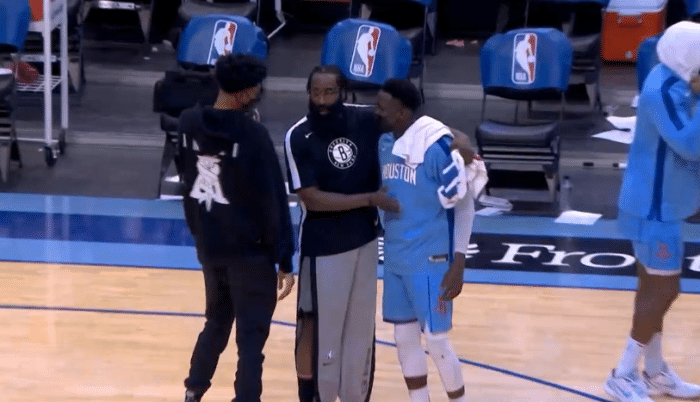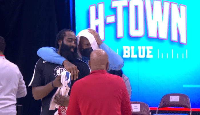 暖心!哈登拥抱沃尔奥迪等火箭前队友,现场送签名战靴后穿袜子离场