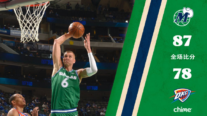 末节,波尔津吉斯连续两记三分帮助球队扩大分差,两队此后各有得分,雷霆难以追近比分,换上替补鸣金收兵,最终独行侠87-78战胜雷霆。