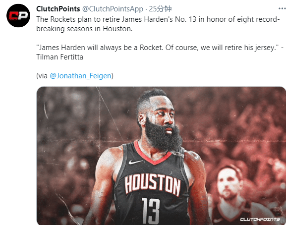 火箭记者费根最先报道,费尔蒂塔明确表态将在未来退役哈登13号球衣,随后众美媒疯狂晒照转发这样的重磅消息,美媒NBA Central发推写道:当之无愧!