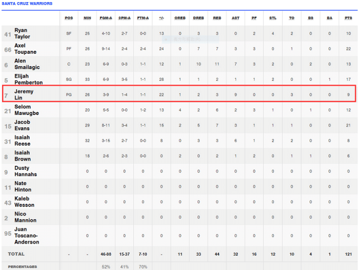 比赛中林书豪得分虽然不是很多,只有9分入账,没有了复出之后首战25分的豪迈,但是林书豪的助攻非常多,比赛初期圣克鲁兹勇士很快打开局面,和林书豪的助攻有着直接的关系,他的传球总是可以找到最合适位置上的队友,所以圣克鲁兹勇士拿下了一场大胜,豪取9连胜。