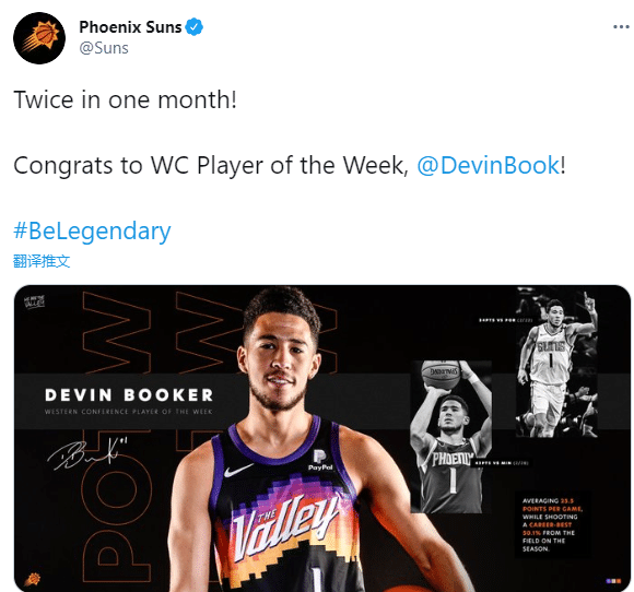 布克在上周率领太阳取得了3胜1负的战绩,场均得到33.0分2.8篮板4.3助攻——过去4场比赛,布克三场轰下30+,击败森林狼高效狂砍43分5篮板5助攻,又一次当选西部周最佳球员;目前太阳22胜11负排名西部第四。太阳官方恭喜布克:一个月内两次当选西部周最佳。