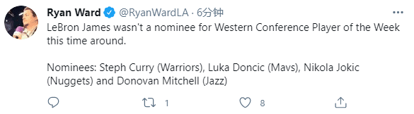 西部获提名球员还有库里、东契奇、约基奇和米切尔,湖人球星詹姆斯没有获得西部周最佳提名。