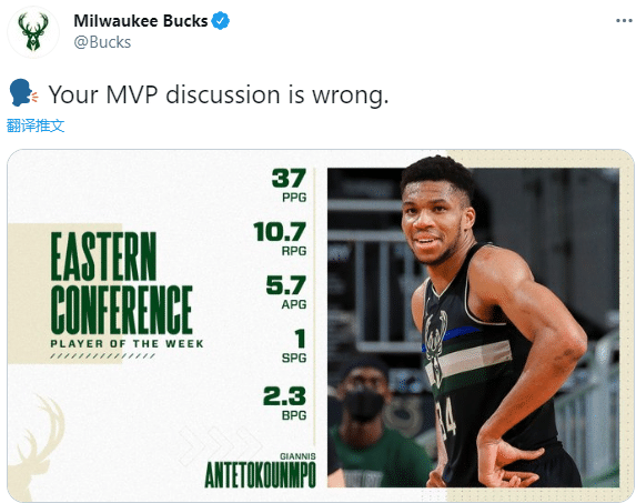 字母哥本赛季首次当选东部周最佳球员,职业生涯第14次当选,目前雄鹿21胜13负排名东部第三;雄鹿官方恭喜字母哥当选周最佳,发推写道:你们的MVP讨论是错误的。