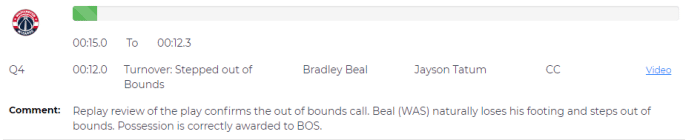 奇才和绿军比赛最后2分钟仅有一次漏判,末节46.9秒,凯尔特人球员哈维特-格林在没有防守任何球员的情况下,站在禁区超过3秒,应该吹罚格林防守违例;在这一个回合中,比尔持球突破打进关键两分。