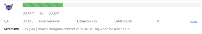 最后两分钟出现一次错判,终场前35.5秒福克斯防守三球时有一个伸手抢球的动作,但这种接触并不构成犯规;当时裁判吹罚福克斯犯规导致后者一脸不理解,事实证明裁判的吹罚是错误的。