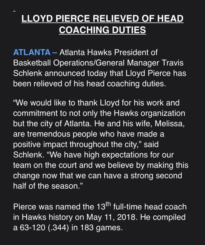 赛季至今,老鹰仅仅拿到14胜20负的战绩,排名东部第11位,战绩不佳是老鹰解雇皮尔斯的最大原因;皮尔斯是老鹰队史第十三任主帅,执教老鹰183场比赛,战绩63胜120负,胜率仅仅只有34%,在皮尔斯执教期间,老鹰没有进入过季后赛。