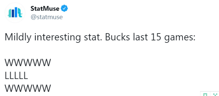 赢下这场比赛后,雄鹿拿到5连胜。数据网站也列出了雄鹿过去15场比赛的过山车表现:5连胜+5连败+5连胜。目前,雄鹿21胜13负,距离东部第二的篮网只差0.5个胜场,距离东部第一的费城也只有1个胜场的差距了。