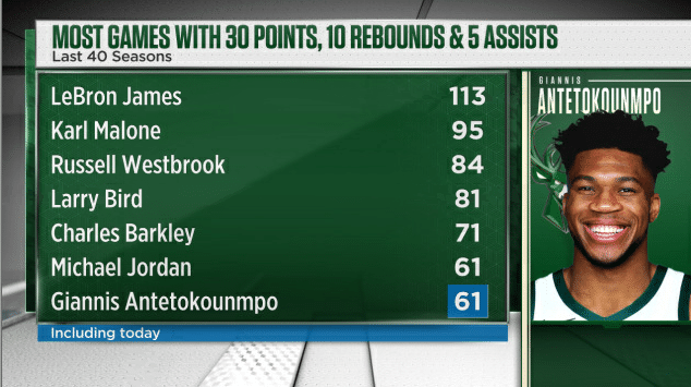 第二,字母哥生涯至少30分10板5助的比赛,已经达到61场,追平了传奇球星乔丹,是过去40年来第六多的。排在他前面的是詹姆斯(113次)、马龙(95次)、韦斯布鲁克(84次)、伯德(81次)和巴克利(71次)。