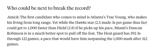 名记萨姆-阿米克表示,第一个出现在他脑海里的人选是老鹰的特雷-杨,这也是一个知名的三分投手。实际上,特雷-杨生涯至今场均命中2.5个三分,如果他想破纪录,就得加快步伐了。特雷-杨并不是最可能打破纪录的那个人,阿米克更看好热火射手邓肯-罗宾逊,他的机会更大。