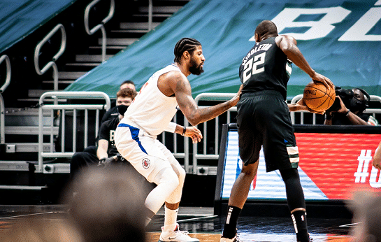 面对字母哥,乔治干拔三分球出手不中;