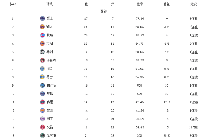 爵士以27胜7负的成绩高居联盟第一,米切尔和戈贝尔带队表现抢眼。湖人今天大胜勇士26分,重新反超快船,升至第二名。快船今天最后4分钟一分未得,卡椒组合决胜时刻9中0掉链子被雄鹿击败。太阳今天大胜森林狼,布克表现非常出色,他们稳居西部前四。马刺的战绩是17胜12负,他们的表现也出乎了不少人的意料。开拓者吃到4连败,他们的表现起伏波动非常大。掘金战绩是18胜15负,他们近期在约基奇的发挥表现。勇士今天被快船击败,单节落后20分,分差一度拉大到30+,科尔的球队吞下了一场26分的惨败。
