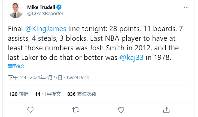 全场比赛,詹姆斯21中11高效送出28分11板7助攻4断3帽的华丽全面数据,据记者trudell统计,NBA上一位打出这串数据的球员还得追溯到2012的约什史密斯,而湖人上一次打出这种数据的球员是1978年的贾巴尔!