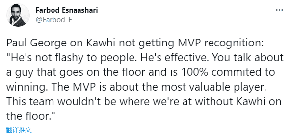 谈到小卡不是常规赛MVP有力争夺者,乔治表示:他很有效率。你说的是一个在球场上100%致力于获胜的人。MVP是最有价值的球员,如果在场上没有小卡,这支球队就不会有我们现在的位置。