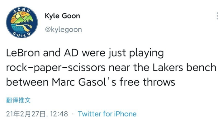 值得一提的是在比赛期间,詹姆斯和浓眉哥在队友加索尔罚球的间隙,居然玩起了石头剪刀布,不得不说詹姆斯的心态还是很好的,他也知道如果在比赛期间释放自己的压力,和好友浓眉哥一起互动。