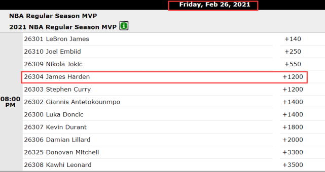 来源:24直播网02-27 10:2524直播网讯北京时间2月26日,2020-21赛季常规赛MVP的赔率排名更新,詹姆斯(+140)、恩比德(+250)、约基奇(+550)依然排在前三,而状态火热的哈登已经升至第四,和库里同为+1200。要知道2月初的MVP赔率排行榜上,哈登连联盟前16名都没进,显然他近期的状态征服了不少人。