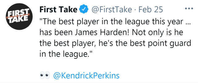 球评帕金斯也在最近一期的First Take节目上表示:“今年联盟里最好的球员就是詹姆斯-哈登。他是最好的球员,也是最好的控卫。”