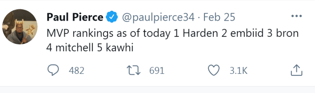 前NBA球星保罗-皮尔斯退役后也成为了一位球评。他在社媒上给出了心中的本赛季MVP排名,哈登高居第一位,随后才是恩比德、詹姆斯、米切尔和小卡。显然,皮尔斯的言论也相当于认可了哈登本赛季表现最佳。