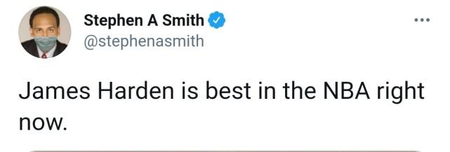 ESPN名嘴斯蒂芬-A-史密斯在最近的节目上称赞哈登的表现,认为他如果继续以现在的方式打球,他很可能能赢下个人职业生涯的第二座MVP奖杯。史密斯转发自己在节目视频时还配文写道:“哈登在现在的NBA联盟里就是最强的。”