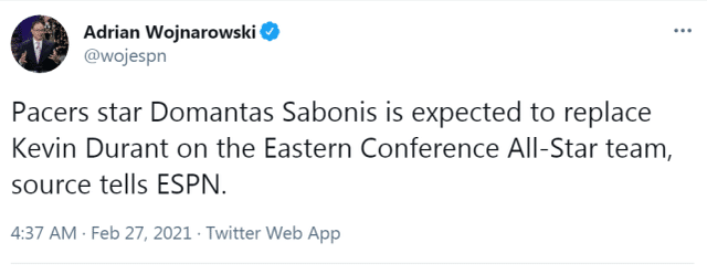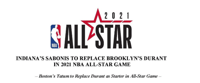 来源:24直播网02-27 10:2024直播网讯北京时间2月27日,篮网官方宣布,凯文-杜兰特因左腿筋伤势需要更多恢复时间,将缺席本赛季的全明星正赛。随后,NBA官方宣布,步行者球星小萨博尼斯将顶替受伤的杜兰特,入选东部全明星阵容,杜兰特的全明星首发位置,由绿军的塔图姆替代。