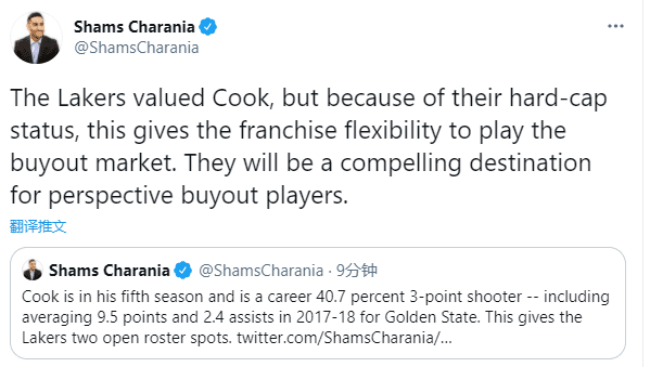 名记Shams表示预计会有多支球队对库克感兴趣,在裁掉库克后,湖人将会有两个阵容名额的空缺!随后shams跟进报道,湖人其实很看重库克,但因为硬工资帽的原因,他们不得不裁掉库克以此来增加球队在买断市场上的灵活性!湖人将会成为买断球员们非常有吸引力的目的地。