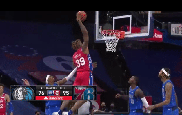 今天的比赛76人这边的内线大将霍华德发挥十分出色,他打了16分钟,前6次出手全部命中,但是最后一记三分球投失,他7中6得到了14分8篮板1助攻1抢断3盖帽的数据,填满了数据栏。第四节的比赛还剩下8分多钟的时候,霍华德接到队友传球完成了一记精彩的单臂暴扣,这记扣篮可以说是技惊四座,76人的替补席瞬间被点燃了,这记扣篮也是引来了球迷的热议,有球迷说道:超人归来,魔兽梦回巅峰。