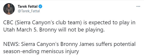 来源:24直播网02-26 15:3324直播网北京时间2月26日/讯詹姆斯大儿子布朗尼伤势最新情况曝光,据名记Tarek Fattal报道,CBC(加州篮球俱乐部)计划于3月6日在犹他开始比赛,布朗尼所在的塞拉峡谷高中就是CBC俱乐部的一支球队,布朗尼将不会参加比赛,因半月板伤势很可能赛季报销。