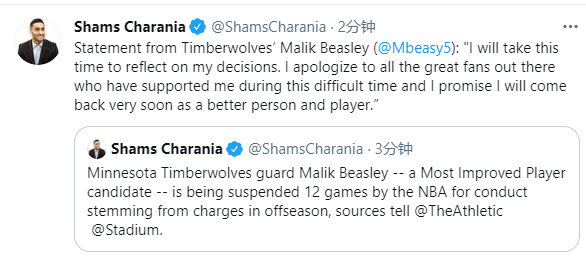 来源:24直播网02-26 15:2924直播网2月26日讯 北京时间2月26日,NBA正式开出一笔重大罚单,据名记shams报道,森林狼后卫马利克-比斯利因休赛期的指控被联盟禁赛12场比赛,他是本赛季最快进步球员奖的候选人,可因为场外的原因,他已经被联盟禁赛12场,目前比斯利已经发表声明。