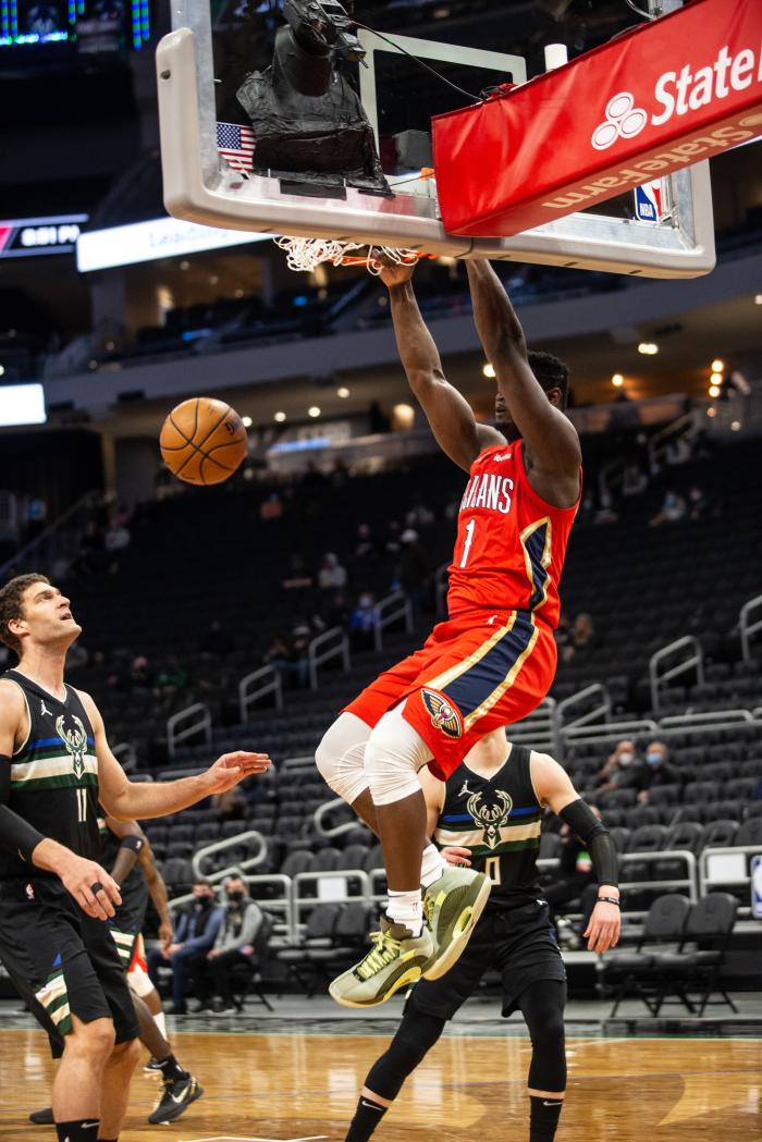 首节比赛,锡安禁区吃饼暴扣,持球突破过掉字母哥上篮得分,单节多次暴扣贡献11分;锡安犹如坦克一般疯狂肆虐禁区,郎佐-鲍尔则是扮演外线射手,两人首节合砍20分大战雄鹿;到了第二节,锡安继续攻击篮筐,防守端钉板大帽迪文琴佐,上半场打得十分高效。