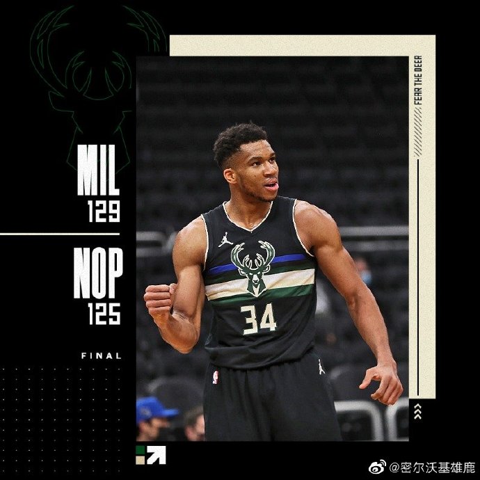 雄鹿129-125险胜鹈鹕 字母哥38+10 米德尔顿31+7 锡安34+8