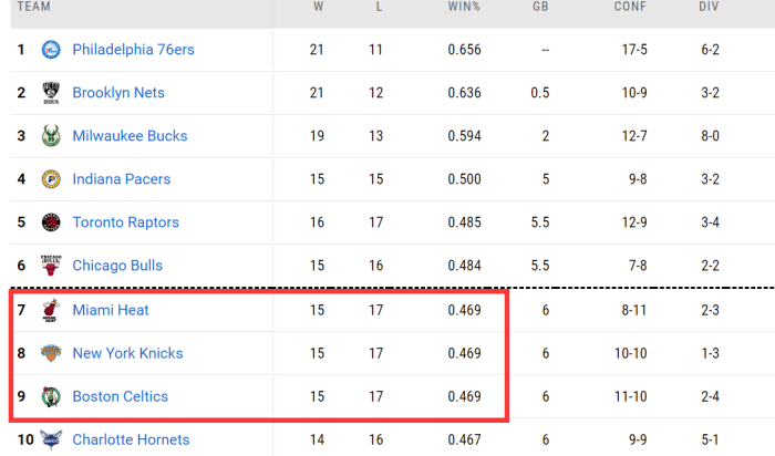 瞬息万变!热火战绩升东部第8!三连败凯尔特人狂跌第十