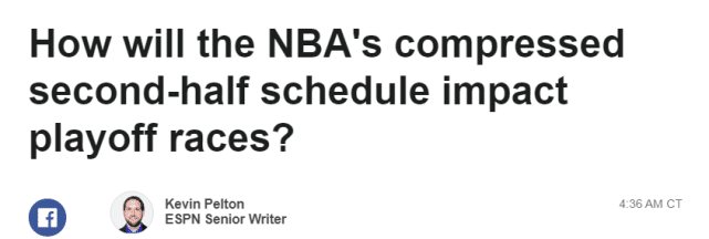 由于第一阶段不少比赛推迟,第二阶段的赛程将会很紧张。美联社用“hectic(忙碌的)”来概括第二阶段的赛程。那么30支球队各自的赛程难度如何?ESPN数据专家佩尔顿给出了答案。