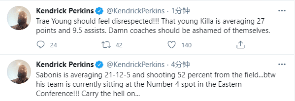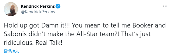 帕金斯先是写道:什么,该死的!!!你是说布克和萨博尼斯没有入选全明星队?太可笑了,这是真话;然后帕金斯列出数据,萨博尼斯场均21胜12负5分,命中率52%;顺便说一句,他的球队目前在东部排名第四!