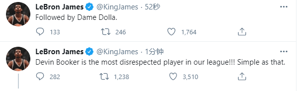 湖人当家球星詹姆斯也替布克鸣不平:布克是联盟中最不受尊重的球员,就这么简单;其次是利拉德。