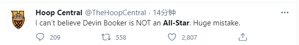 美媒发推写道:我不敢相信布克没有入选全明星,巨大的错误。