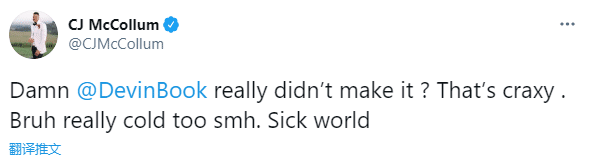 开拓者球星麦科勒姆发推写道:布克没有入选?那真是太疯狂了,这个世界太冷血而且有病。