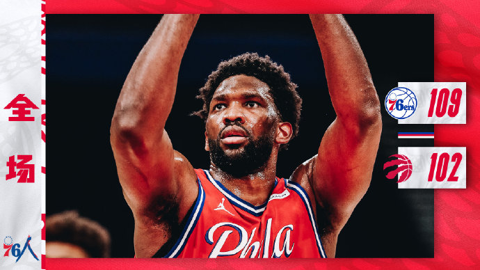 76人109-102战胜猛龙 恩比德18+12 哈里斯23+7+5 西亚卡姆22+6+7
