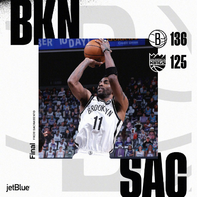 末节,哈登带队继续奋战,到了本节中段时在左侧接手递手传球直接飙射三分命中,也帮助篮网队将分差扩大至接近30分。到了本节末段,国王队奋力追分,并一度将分差缩小至12分,但是随后,欧文命中一记三分,几乎直接杀死比赛。最终,篮网队以136-125战胜国王队。