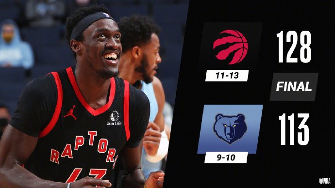 猛龙128-113逆转灰熊 范弗里特32+9 西卡32+6 瓦兰27+20