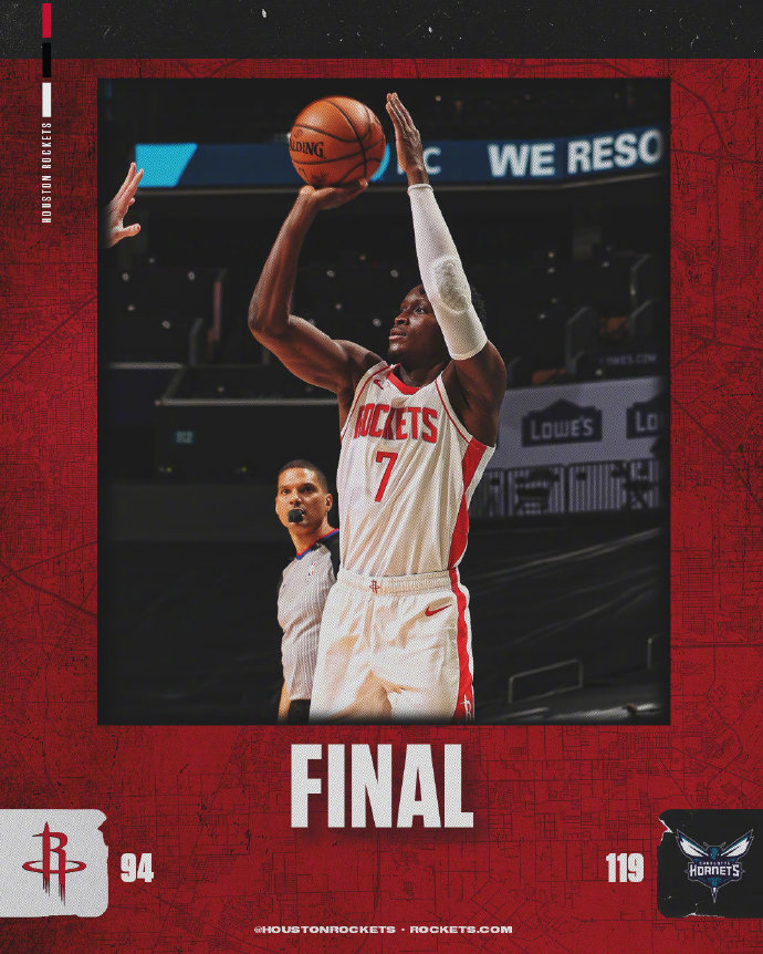 末节,火箭突然崩盘,开局6分钟里仅得1分的表现直接葬送了前三节的努力,而黄蜂抓住机会送出19-1的攻势一举杀死比赛。火箭直到比赛过去接近8分钟的时候才由奥拉迪波命中三分取得第一记运动战进球。最终,黄蜂119-94轻取火箭迎来2连胜。