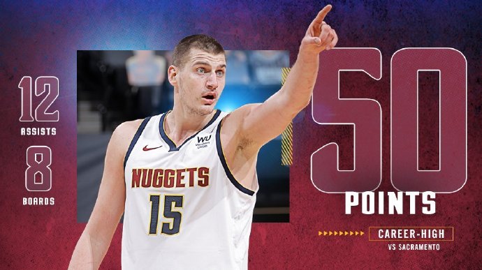 掘金(12-10):约基奇50分8板12助3帽、米尔萨普14分5板,迈克尔-波特8分9板,巴顿11分4板5助,蒙特-莫里斯11分5板9助,格林10分3板,汉普顿7分10板,马库斯-霍华德3分1板。