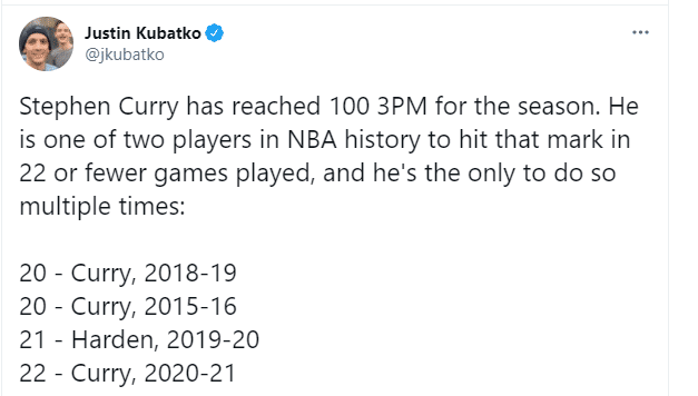据数据分析师justin统计,这是库里本赛季第22场比赛,他的三分命中数突破100个大关!这是NBA历史第4次在出赛场次低于22场的情况下命中至少100个三分!而前三分别是18-19赛季&15-16赛季的库里,以及19-20赛季的哈登!
