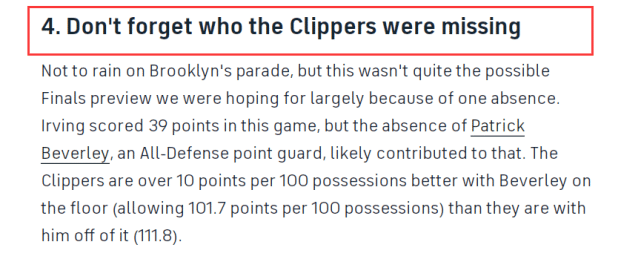 欧文的39分,更说明了一个人的价值。CBS名记萨姆-奎因在赛后报道中强调,快船不是最强版本,别忘了他们有谁还没上场。奎因所指的这位重要成员,是快船控卫贝弗利。他因右膝酸痛缺席多场比赛,如果擅长防守的贝弗利能打,欧文得分只怕没有这么轻松。
