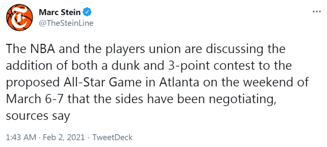 来源:24直播网02-02 10:2624直播网讯 北京时间2月2日,据NBA名记马克-斯坦恩报道,NBA和球员工会正在讨论在亚特兰大举办全明星正赛的同时,也照常进行三分大赛和扣篮大赛。目前,全明星周末的计划时间是3月6日和7日,虽然仍未最终确定举办,但斯坦恩表示联盟有明显的动力去促成这件事。