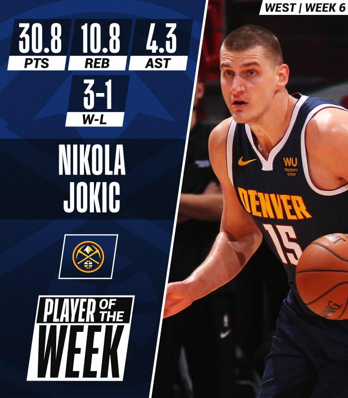 NBA官宣!约基奇场均30+10西部最佳,哈登首次当选东部周最佳