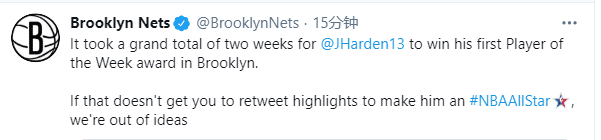 哈登已经为篮网出战8场比赛,期间篮网6胜2负杀到东部第二,场均24.5分11.1助攻6.4篮板,场均得分明显下降,但他为篮网组织进攻,众队友皆得益于他的助攻;篮网官方晒哈登集锦,并且写道:加盟篮网仅两周,便赢得东部周最佳。