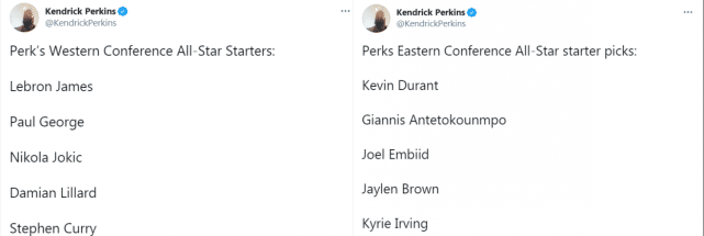 帕金斯选择的东部全明星首发阵容是:欧文、布朗、杜兰特、字母哥和恩比德;西部全明星首发阵容是:库里、利拉德、乔治、詹姆斯和约基奇。