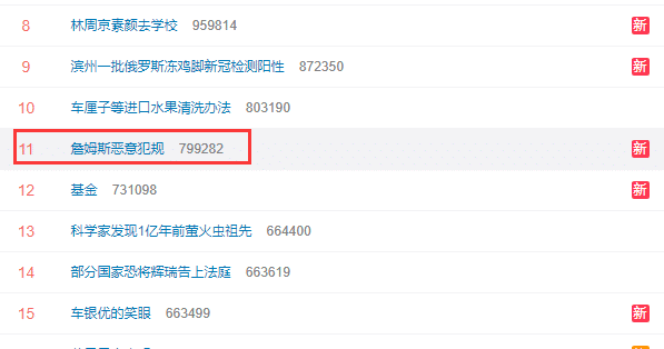 比赛结束之后“詹姆斯恶意犯规”登上热搜榜的前列,这是詹姆斯在第三节推了恩比德一把,后者痛苦倒地不起,裁判当时给了詹姆斯一级恶意犯规,不少球迷都觉得詹姆斯不该有这样的动作,因为他的行为让恩比德直接在空中失去了平衡。