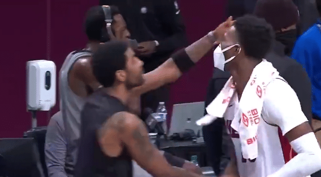 比赛结束之后欧文早早就准备好了自己的战袍,他拿在手中和队友质疑,同时他和不断的示意热火的阿德巴约,戴着口罩的阿德巴约上来和欧文拥抱,然后欧文将他的球衣给了他,欧文终于赠送球衣成功了。