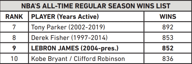 生涯至今,詹姆斯常规赛已经获胜852场,在NBA历史上排名第9位。只要他能帮助湖人战胜骑士,个人的常规赛获胜场数将升至第8位,追平费舍尔(853胜)。他的下一个追赶目标将是马刺名宿托尼-帕克(892胜)。