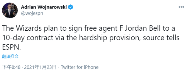 来源:24直播网01-23 21:4924直播网讯 北京时间1月23日,来自NBA名记Woj的报道,奇才计划利用困难特例和自由球员乔丹·贝尔签下一份十天的短合同。困难特例是指在联盟批准的情况下可以增加一个临时的名单位置,前提是至少有四名球员因生病或者受伤超过两周。